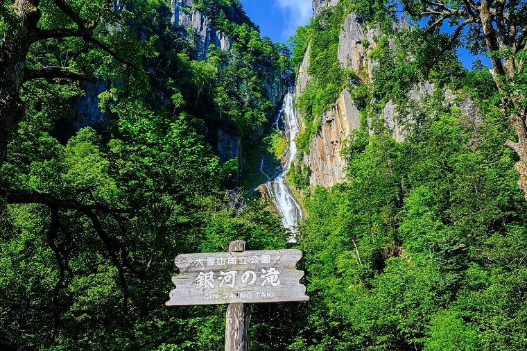 層雲峽谷中最著名,也被比喻為一對戀人的別名男瀧的『流星瀑布』,彷彿一捆粗線軸般從80公尺高的斷崖急速滾下,頗具一番豪情;而像幾條白絲線的『銀河瀑布』,則慢條斯理地從120公尺高的斷崖緩緩流下,難怪另稱女瀧,名列日本瀑布百選的這兩個瀑布,對稱地鑲嵌在谷壁上,觀望比較起來格外有趣,也是遊客合影留念的好所在。