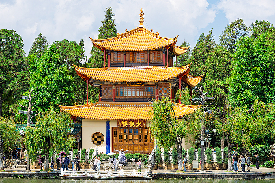 【大觀樓】位於昆明市城西,南臨滇池,隔水與西山 遙望,湖光山色丹霞帆影,十分優美。許多文人墨客來此吟詩作畫,至今尚保存在大觀樓內,園中最令人矚的是懸於大觀樓上180字的長聯,是清朝乾隆年間寒士孫髯翁所作,有「古今第一長聯」之稱。