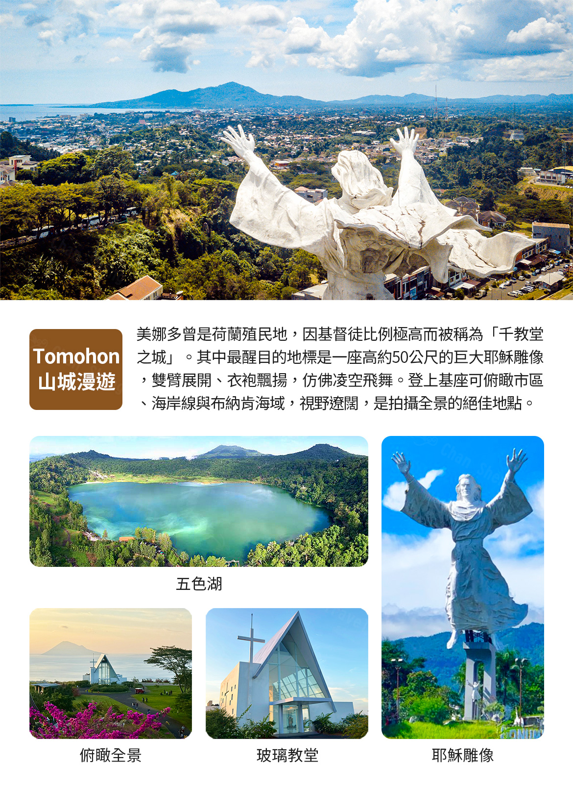 美娜多曾是荷蘭殖民地,當地基督徒比例極高,被稱作「千教堂之城」。這座高約 50 公尺的巨大耶穌雕像矗立在山坡上,雙臂展開、衣袍飄揚,仿佛凌空飛舞。登上基座可俯瞰整個美娜多市區、海岸線與遠方的布納肯海域,視野遼闊,是拍攝全景照的絕佳地點。