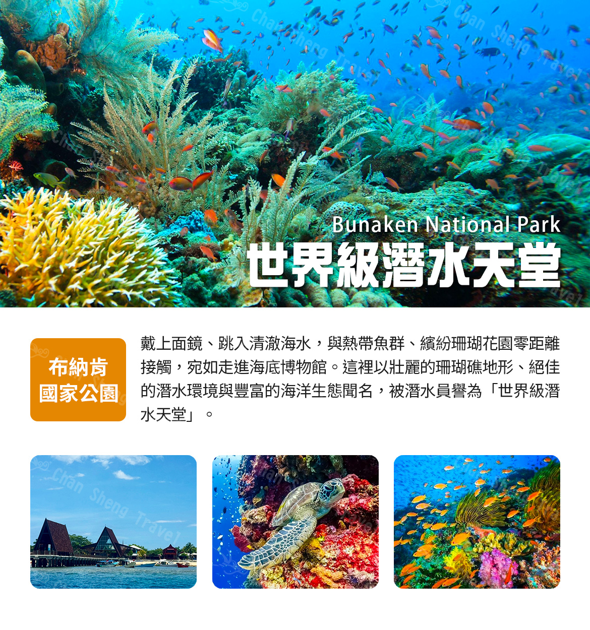 早餐後從 NDC 渡假村私人碼頭出發,專業潛水教練帶領探索布納肯海洋國家公園的經典深潛潛點。