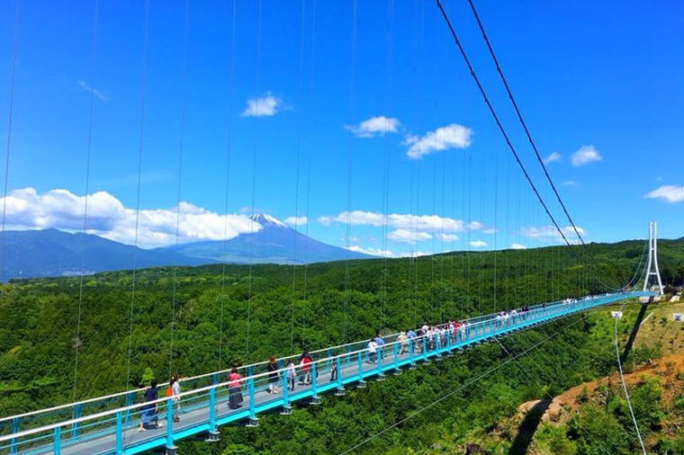 【三島大吊橋】是日本本州最長的人行吊橋,全長400公尺。從橋上可遠眺富士山與駿河灣美景,景色壯麗迷人。橋面略帶搖晃,增添刺激感。周邊設有咖啡廳、花園步道及高空滑索等設施,無論賞景、拍照或體驗活動,都非常適合情侶與家庭前來遊玩。