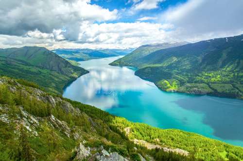 臥龍灣:當地稱卡贊湖即鍋底湖,是取其形狀象鍋底而得名。湖四周森林茂密,繁花似錦、綠草如茵,湖中小島景色秀麗,湖進水處巨石抵中流,激浪拍巨石,玉珠飛濺。湖的泄水口有座木橋飛架東西,站在橋上向北是一平如鏡的臥龍灣向南是奔騰咆哮的喀納斯河。