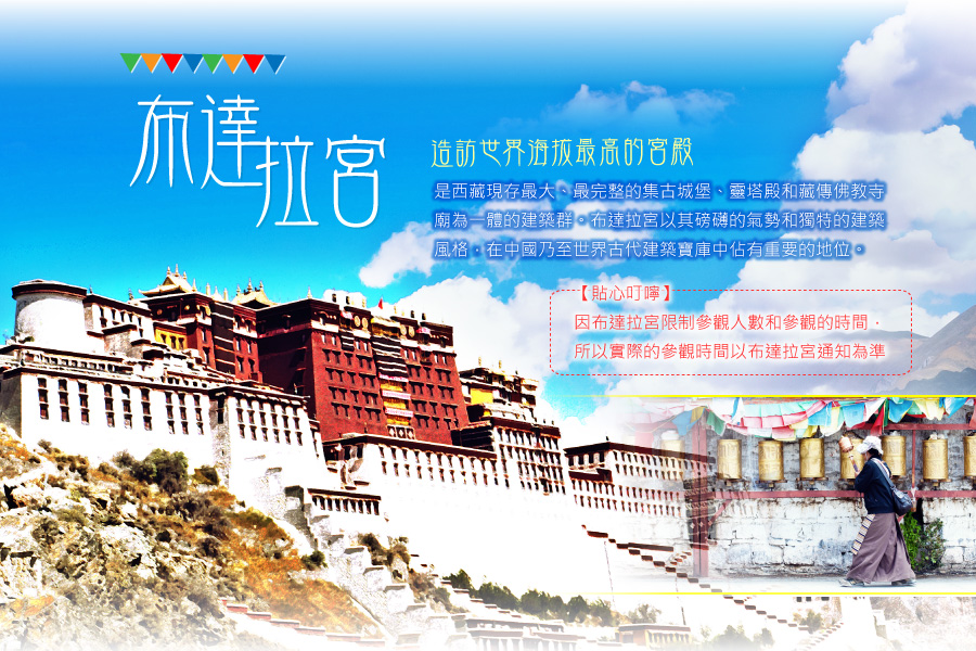 備註:布達拉宮安檢措施非常嚴格,禁止攜帶大件行李、易燃易爆物品及礦泉水等飲料。
