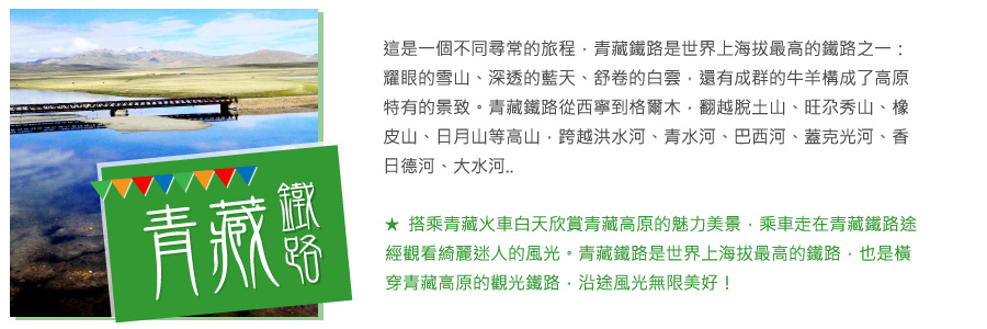 備註:進入高原,海拔高、氣候乾燥、紫外線強,請自備太陽鏡、遮陽帽、防曬霜、雨具、滋潤霜。