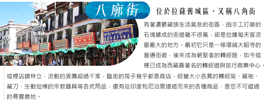 【八角街(下車參觀)】拉薩傳統的街道,藏式房屋建築,在這裏能感受到最具當地特色的人文風情。八廓街又名“八角街”,是拉薩最著名的轉經道和商業中心。街道上到現在依舊會有一些藏民在進行著神聖的轉經儀式,表達內心的虔誠。臨街的房子幾乎都是商店,販賣各種藏族服飾、工藝品,還有來自印度、尼泊爾等地的商品。