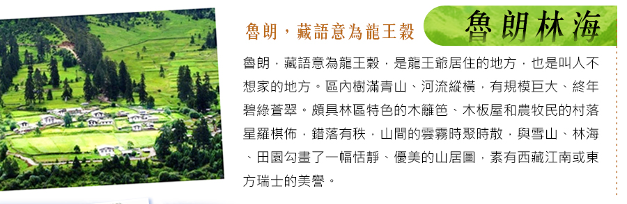 【魯朗林海觀景台(下車參觀)】每年4月中旬到6月初,成千上萬種野花競相開放,山間雲霧時聚時散,雪山、林海、田園勾畫了一幅恬靜、優美的“山居圖”。魯朗林海位於一片典型的高原山地草甸狹長地帶,林海由兩側青山中的灌木叢和茂密的雲杉、松樹組成,樹木以青岡為主,林海中間則是整齊劃一的草甸,溪流蜿蜒其中,此外還有大量鳥類棲息於此。