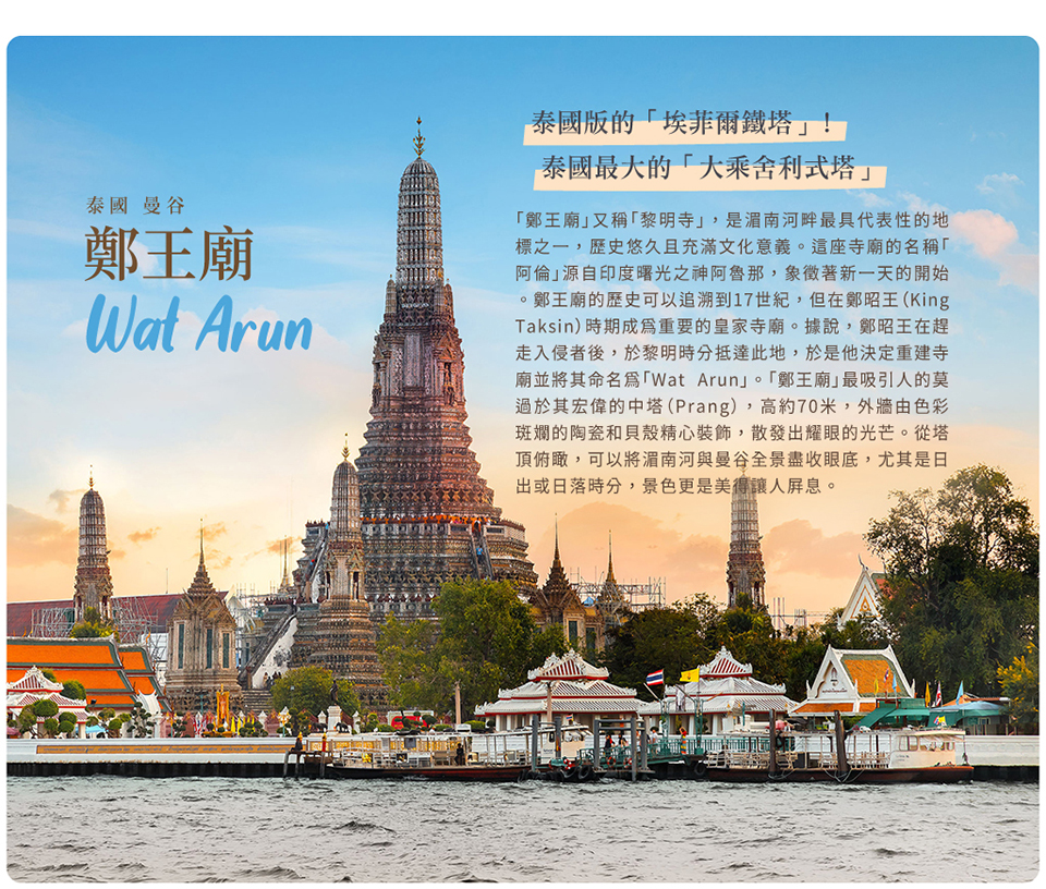 【鄭王廟】黎明寺又稱作曉廟、鄭王寺或鄭王廟,是泰國首都曼谷市曼谷艾縣「血脈之河」湄南河西畔的一所佛教寺院。它是泰國境內規模最大的大乘舍利式塔,因此享有「泰國埃菲爾鐵塔」的美稱。位於湄南河支流昭披耶河西畔的吞武里區。始建於泰國的大城王朝,在鄭昭遷都到此地創建吞武里王朝之後,吞武里區也日益興盛。寺廟於1809年竣工,1847年又被重修。它是大城時期孟庫國王時代留下的最偉大的創舉、最璀璨的文化遺產,這使得黎明寺成為現今昭披耶河畔最古老的建築、參觀量最高的寺廟(黎明寺每日對外開放)。黎明寺的主塔高達82米,這座主塔是泰國著名的建築,刻在了10泰銖的硬幣背面。底座和塔身均呈方表,層數很多,面積逐層遞減。四周各有陪塔一座,顏色各異,宏偉華麗,比主塔矮小几倍。塔上鋪貼許多彩色碎陶瓷。寶塔的地基部分繪有巨幅圖畫。