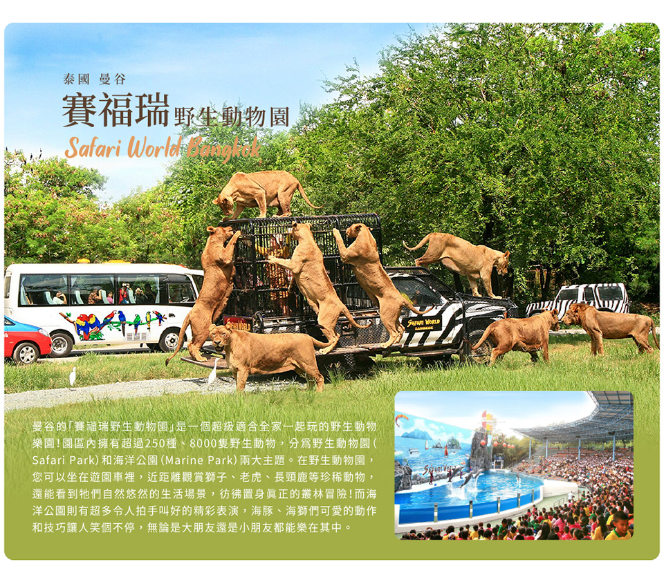 占地廣達5千公頃號稱全亞洲最大野生動物園,僅距離曼谷市區約45分鐘車程【曼谷塞福瑞野生動物園Safari World Bangkok】園區分為可搭乘遊園車的「野生動物園」、「海洋公園」、「叢林漫步」三大區,此外還有海豚、海獅及陸上動物和鳥類表演、餵食秀和西部牛仔秀等,還有叢林泛舟等娛樂設施,園區內也有禮品店和餐廳可供買紀念品和休憩用餐,。