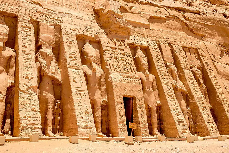 位於埃及南端的阿布辛貝大小神殿(Abu Simbel Temples),由拉美西斯二世在沙漠岩壁上精雕而成,是古埃及最具震撼力的石刻建築。大殿入口處四座高達20公尺的法老巨像直面尼羅河,氣勢雄偉,象徵王權與神性的結合;內部神廟深邃,壁畫細緻描繪戰功與祭祀場景。