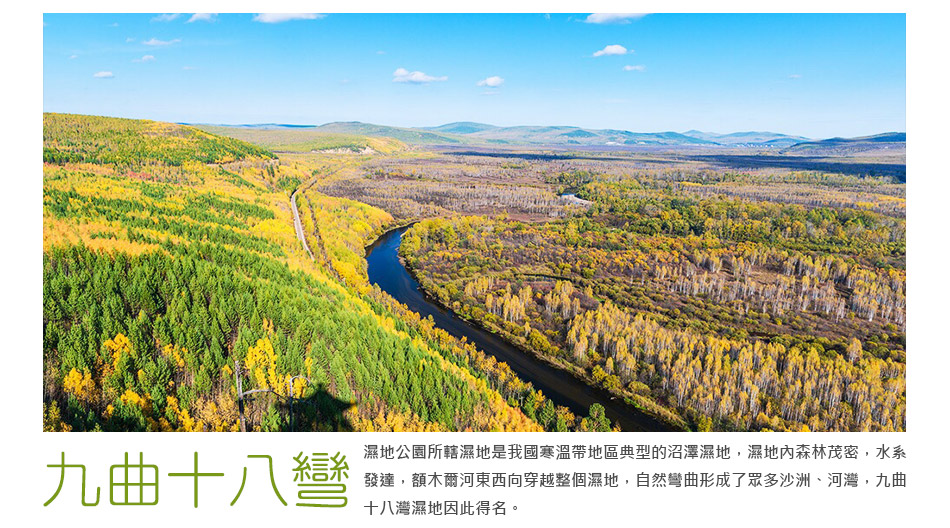 【九曲十八彎】濕地公園所轄濕地是我國寒溫帶地區典型的沼澤濕地,濕地內森林茂密,水系發達,額木爾河東西向穿越整個濕地,自然彎曲形成了眾多沙洲、河灣,九曲十八灣濕地因此得名。