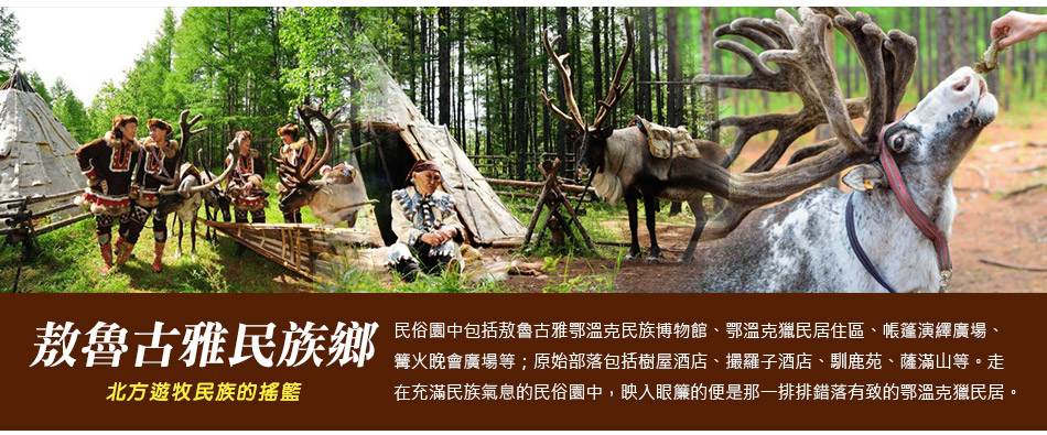 【敖魯古雅民族鄉】鄂溫克獵民的祖先居住在外貝加爾湖和貝加爾湖沿岸地區,敖魯古雅部落位於根河市西郊的林中,是根河、潮查河、西烏齊亞河的交匯處,敖魯古雅為鄂溫克語意為“楊樹林茂盛的地方”敖魯古雅鄂溫克族是中國最後一個狩獵民族是中國唯一飼養馴鹿的少數民族。敖魯古雅鄂溫克民族的歷史、文化、宗教、習俗在這裏進行了充分的展示。
