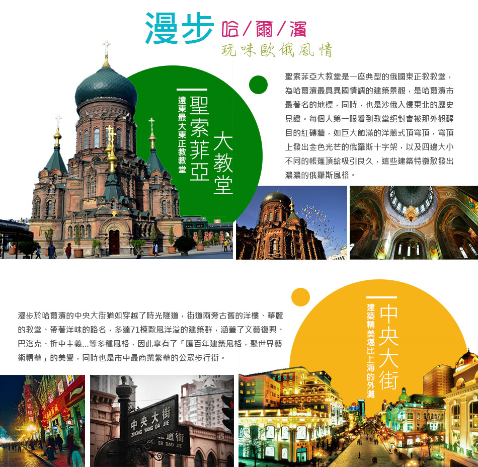 【中央大街】位於哈爾濱道裡區最繁華的商業中心,始建於1898年,全長1450米,占地面積約1平方公里,是目前亞洲最大最長的步行街。全街建有歐式及仿歐式建築71棟,並匯集了文藝復興、巴羅克、折衷主義及現代多種風格市級保護建築,是國內罕見的一條建築藝術長廊,是目前亞洲最大最長的步行街之一。您可以享受北國自在的購物情趣,大街上充滿俄羅斯、法式建築物風情,在此可讓您體驗北國人士之風土人情。