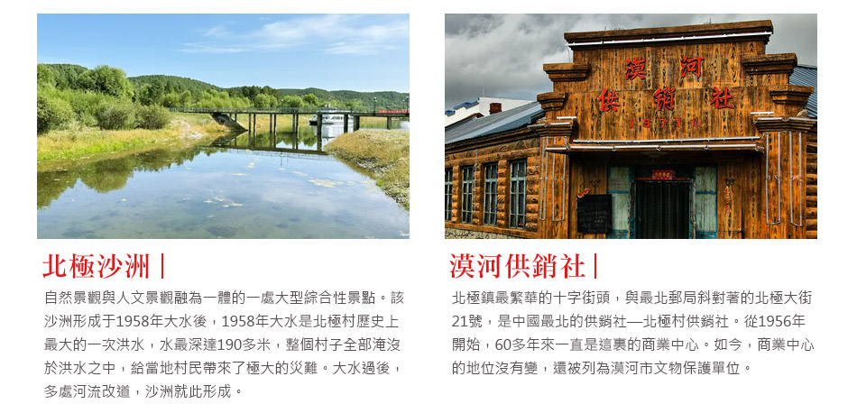【北極沙洲】位於中國黑龍江省大興安嶺地區漠河市北極鄉,1958年大水後形成。為自然景觀與人文景觀融為一體的一處大型綜合性景點。該沙洲形成于1958年大水後,1958年大水是北極村歷史上最大的一次洪水,水最深達190多米,整個村子全部淹沒於洪水之中,給當地村民帶來了極大的災難。大水過後,多處河流改道,沙洲就此形成。如今地面仍以細沙為主,這是因為質地較輕的黑土被洪水沖走,遺留下大量細沙所致。