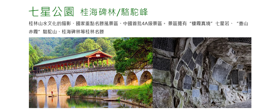 【七星公園(桂海碑林、駱駝峰) 】位於桂林市區灕江東岸,景區由普陀山的天樞、天璿、天璣、天權四峰與月牙山的玉衡、開陽、瑤光三峰組成。北四峰象鬥魁,南三峰象斗柄,七峰並峙,幾乎在同一平面,排列佈局猶如北斗七星,故而統稱為七星山,景區也因此而得名。這裡集桂林山、水、洞、石、庭院、建築、文物之大成,堪稱桂林山水與文化的縮影。園內的著名景點包括桂海碑林、駱駝峰等。 桂海碑林:由龍隱洞、龍隱岩兩處石刻組成,此處壁無完石,碑刻如林,共有石刻220多件,內容與形式相當多樣,均為稀世珍品,具有極高的史料價值和書法藝術欣賞價值。 駱駝峰:為桂林市名山之一,因其狀態酷似駱駝,遂名之。明代末年有江南名士隱居於此,遍種桃花,花開如紅霞一片,色澤斑斕,頗為壯觀,而駝峰赤霞的景觀,也成為桂林十大景之一。