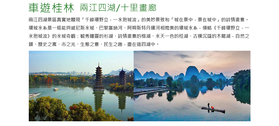 【車遊兩江四湖】兩江四湖景區真實地體現了「千峰環野立,一水抱城流」的美妙景致和「城在景中,景在城中」的詩情畫意。環城水系是一條能與威尼斯水城、巴黎塞納河、阿姆斯特丹運河相媲美的環城水系,領略《千峰環野立,一水抱城流》的水城奇觀:毓秀鐘靈的杉湖、詩情畫意的榕湖、水天一色的桂湖、古樸沉諡的木龍湖,自然之韻、歷史之寓、市之光、生態之意、民生之趣,盡在這四湖中。