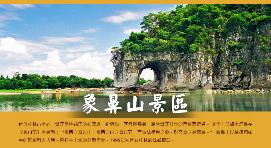 【象鼻山景區】因有一座酷似大象的象鼻山而得名,象鼻山位於桂林市灕江與桃花江的匯流處,以其獨特的山形和悠久的歷史成為桂林城徽標誌。 象鼻山:原名灕山,山因酷似一隻站在江邊伸鼻豪飲灕江甘泉的巨像而得名,在鼻腿之間造就一輪臨水明月,構成象山水月的奇景,被稱為桂林山水的象徵,在觀景台可一覽全景,眺望灕江景色,湖光山色,清新如畫。