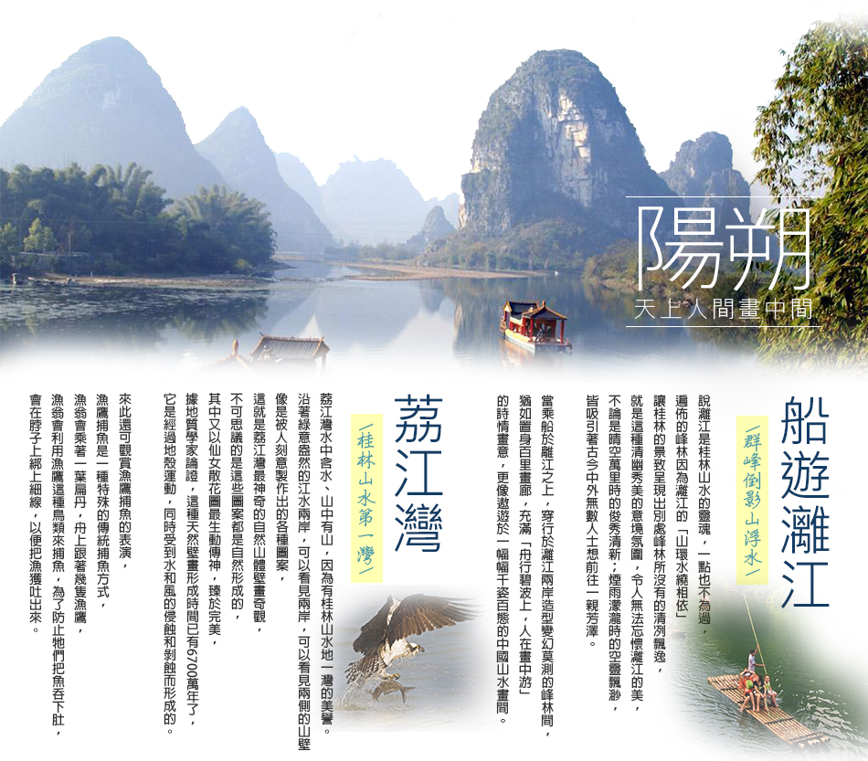 【灕江精華遊(福利碼頭)】灕江有中國最有味道的江之美譽,您可以看到桂林山水甲天下,百里畫廊的美景。此外這裡也是聞名中外的電影《劉三姐》外景拍攝地,山青水秀,江面寬闊,群峰倒影,村莊田園翠竹掩映,宛如一幅幅奇妙山水畫卷,欣賞中國最有味道的灕江秀美的自然山水。