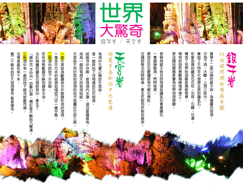 【銀子岩】典型的喀斯特地貌,貫穿十二座山峰,屬層樓式溶洞,洞內彙集了不同地質年代發育生長的鐘乳石,晶瑩剔透,潔白無瑕,宛如夜空的銀河傾斜而下,閃爍出似鑽石的光芒,大自然的鬼斧神工在這裡展示得淋漓盡致,被譽為世界溶洞奇觀。洞內的每一處都是獨立成景,形象各異的石柱呈現出色彩繽紛的景緻,著名景觀有三絕,包含雪山飛瀑、音樂石屏、瑤池仙境,而三寶是為佛祖論經、混元珍珠傘、獨柱擎天,擁有千姿百態,寓意深遠。