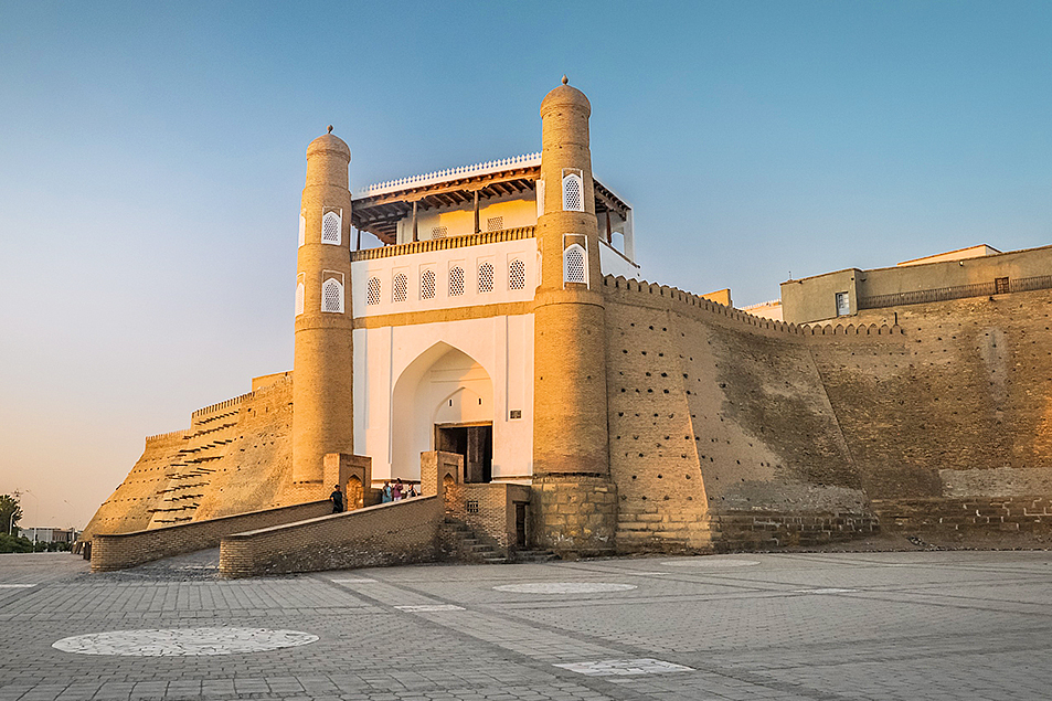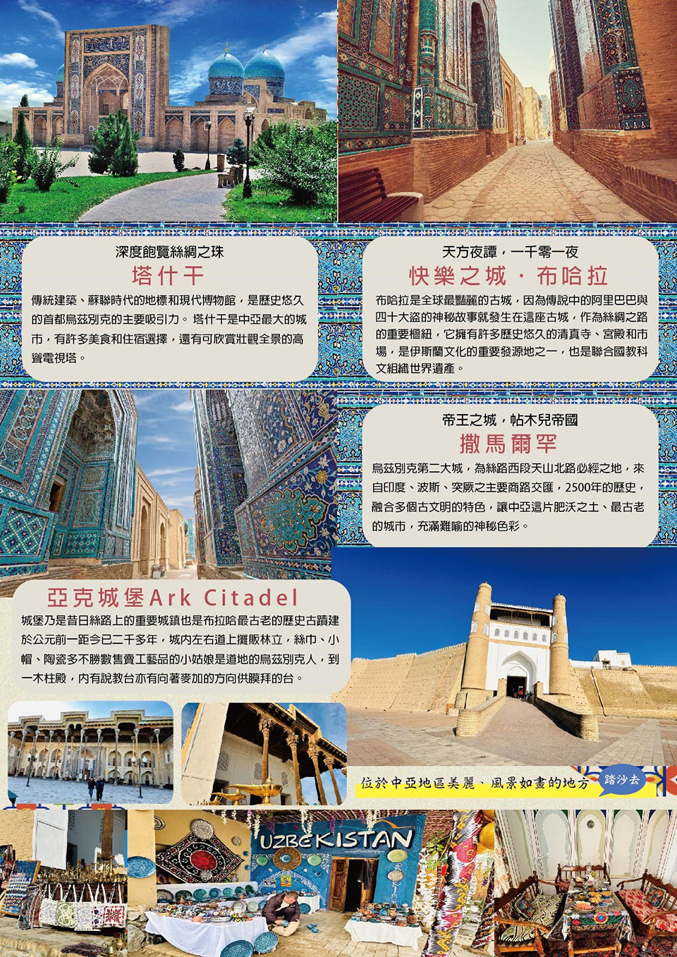 【亞克城堡Ark Citadel】城堡乃是昔日絲路上的重要城鎮也是布拉哈最古老的歷史古蹟建於公元前一距今已二千多年,城內左右道上攤販林立,絲巾、小帽、陶瓷多不勝數售賣工藝品的小姑娘是道地的烏茲別克人,高鼻深眼,輪廓分明,都很美麗沿城而上,到一木柱殿,內有說教台亦有向著麥加的方向供膜拜的台那是因為伊斯蘭教的殿堂建築甚古, 具有歷史價值旁邊的屋宇中有很多弓箭、衣服、茶具等展覽,現在改為歷史博物館。