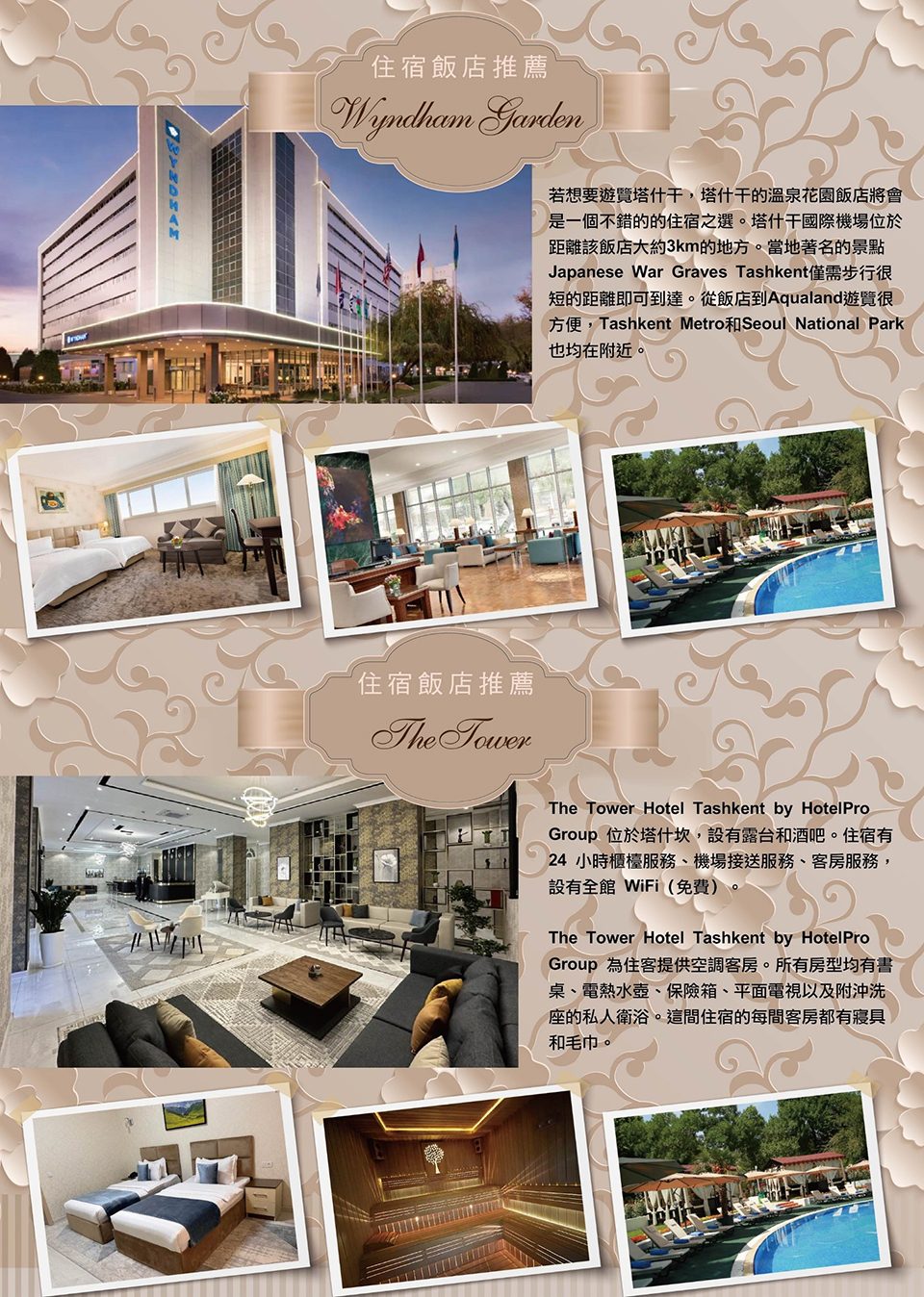 住宿:塔什干Ramada Encore By Wyndham或Wyndham Garden Hotel或 The Tower 或同等級
