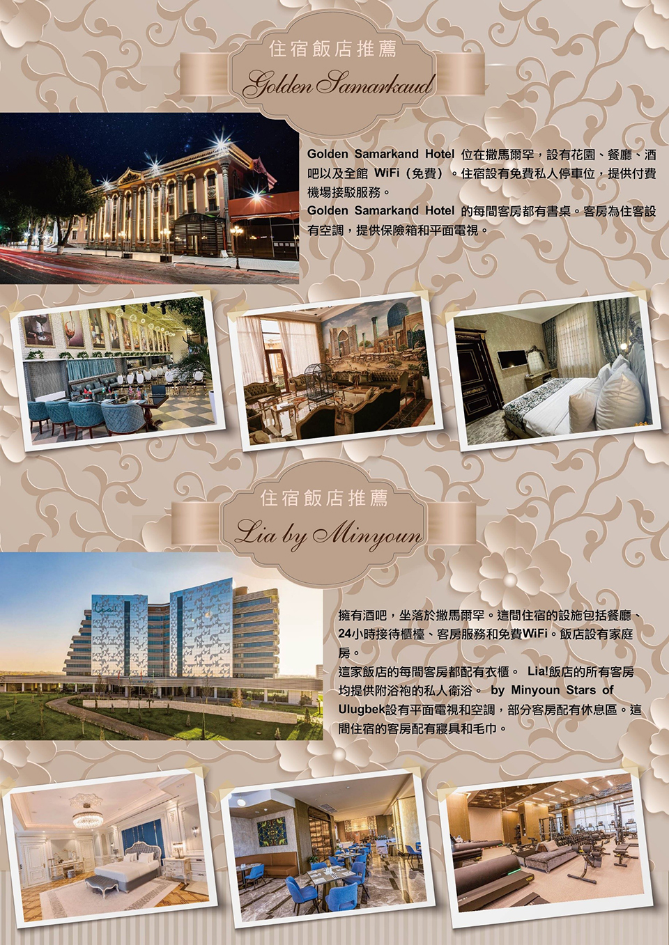 住宿:撒馬爾罕Golden Samarkand Hotel 或 Lia by Minyou Hotel 或Hilton Garden inn Sogd 或同等級