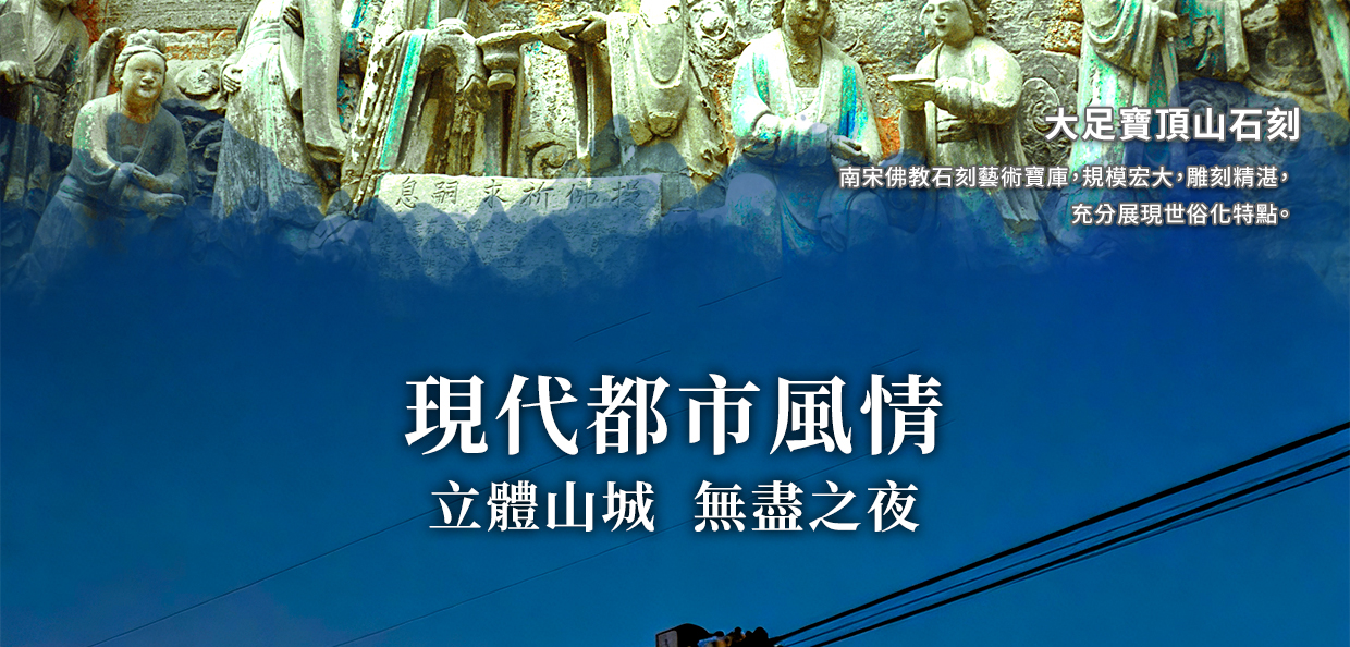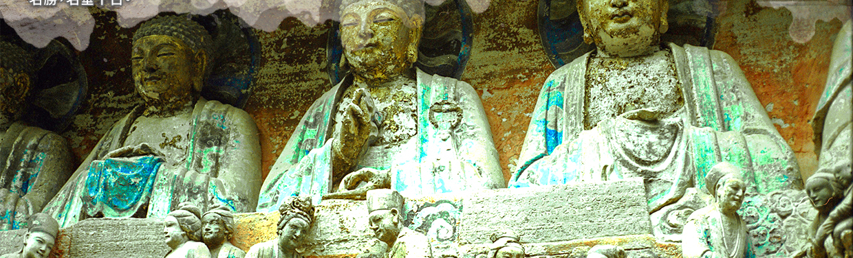 世界文化遺產,與山西「大同雲崗石窟」、河南「洛陽龍門石窟」和甘肅「敦煌莫高窟」,並稱為中國四大石窟。 大足石刻最初開鑿於初唐永徽年間,歷經晚唐、五代,盛於兩宋,明清時期亦有所增刻,最終形成了一處規模龐大,集中國石刻藝術精華之大成的石刻群,堪稱中國晚期石窟藝術的代表。大足石刻其規模宏大、雕刻精美、題材多樣、內涵豐富、保存完整而著稱於世;以集釋(佛教)、道(道教)、儒(儒教)「三教」為一體,世所罕見;以鮮明的民族化、世俗化、生活化特色在中國石窟藝術中獨樹一幟,這些石刻以其藝術品質極高、題材豐富多變而聞名遐邇,從世俗到宗教,鮮明地反映了中國這一時期的日常社會生活,並充分證明了這一時期佛教、道教和儒家思想的和諧相處局面。