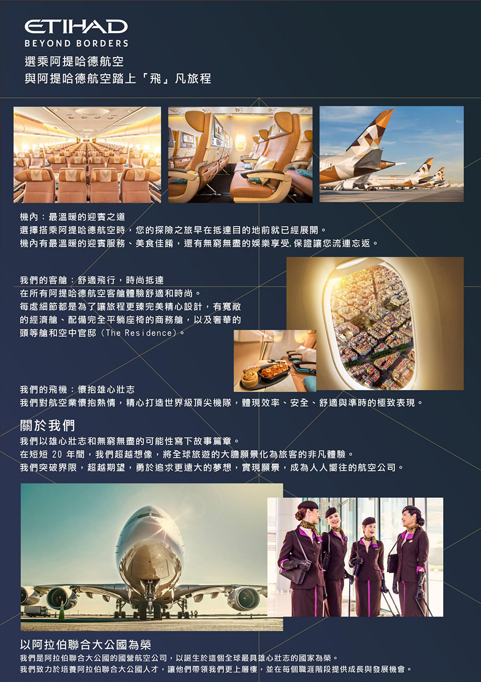1. 使用阿提哈德航空,飛往歐洲航班可攜帶每位一件託運行李且每件限重23公斤,一件手提行李每件限重7公斤