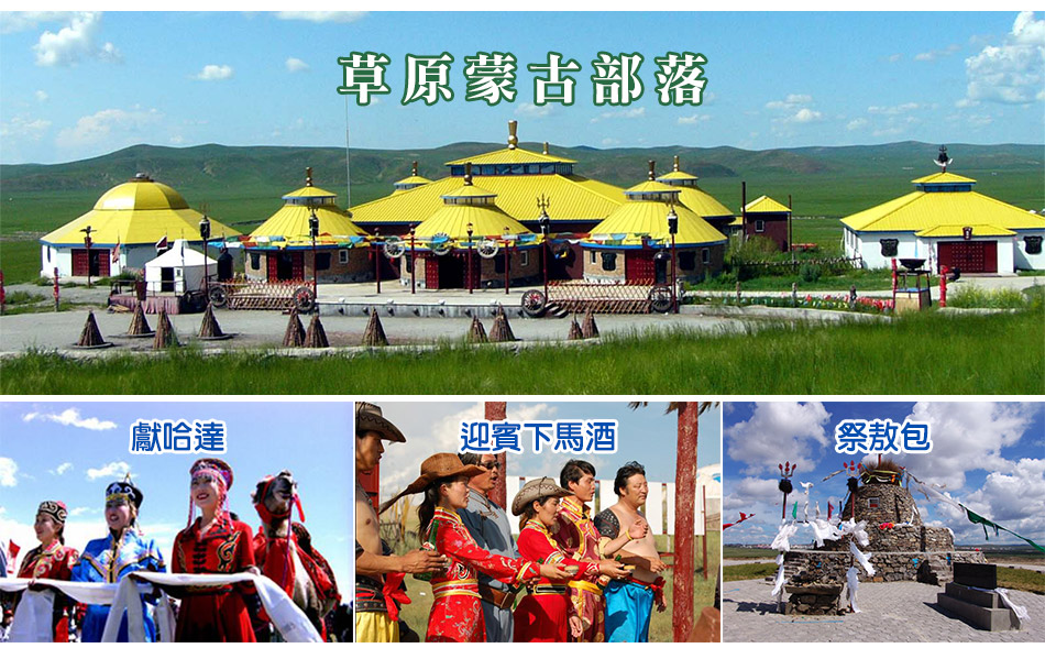 【草原蒙古部落】品嘗下馬酒、祭祀敖包。遊客們可在景區內自由漫步,這裡可稱作是呼倫貝爾草原風光的代表。草原綠茵如毯,鮮花爛漫,蒙古包點點,猶如綠海中的白帆。接著安排訪問牧民家庭,穿著民族服裝照相,品嘗奶食品。