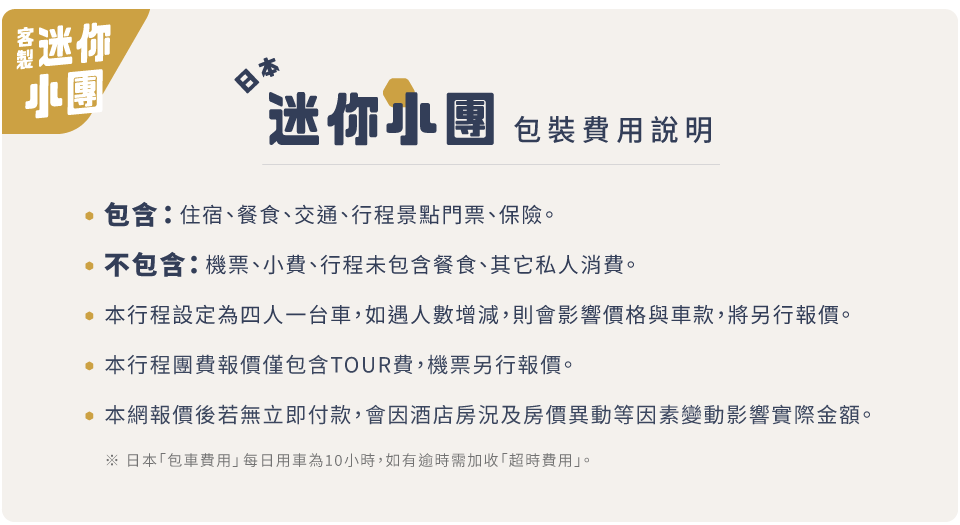 *本行程報價僅適用持台灣護照旅客,如持外國護照參團,敬請另外詢價並自理日本簽證。報名時並請確認護照效期自回程日起算足夠6個月以上。