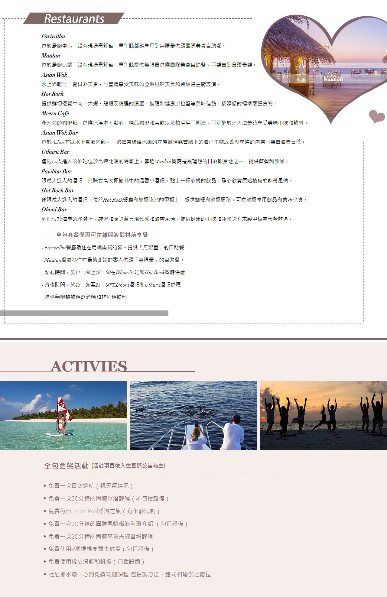 • 早餐 Farivalhu 餐廳(07:30~10:00)、午餐(12:30~14:00)和晚餐(19:00~21:00)在 Farivalhu 餐廳和 Maalan 餐廳;均提供 ⾃助餐。